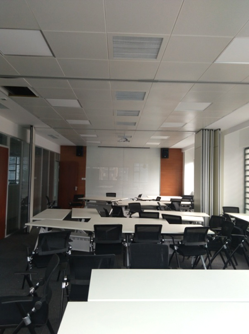整個系統分為辦公區域背景音樂系統及會議室擴聲系統,其中背景音樂系統可實現24小時全自動化定時定點播放音樂;會議室擴聲系統可實現一套設備多個會議室使用:移動式的控制系統(航空機柜安裝)+全頻音箱(吊頂安裝);從根本上實現了甲方對于音響擴聲系統的要求。
