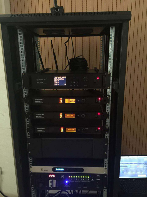 2、無線傳輸過遠問題:現場機房接收端與會場發射端距離較遠,易造成無線信號傳輸問題。解決方案:a、2.4G無線會議話筒的運用,杜絕了U段和V段頻段干擾的同時,擺脫了有線施工造成的線路問題;b、話筒天線放大系統解決了機房距離主席臺距離過遠造成的斷頻問題。